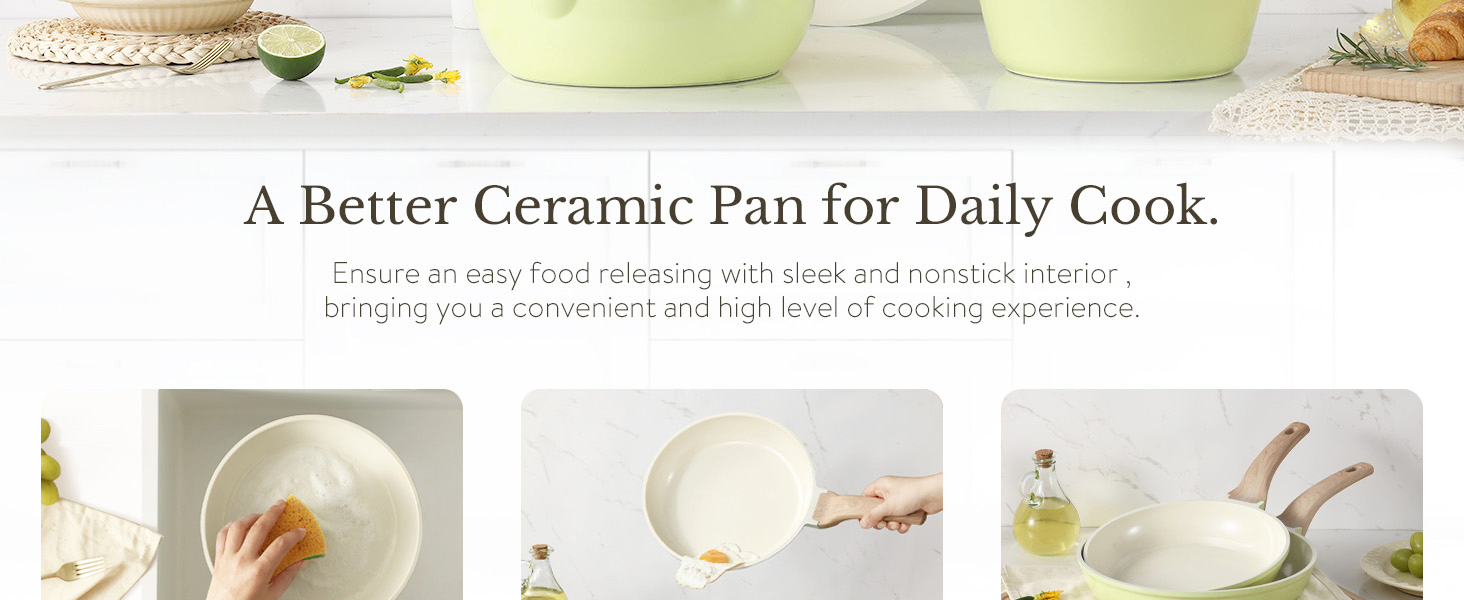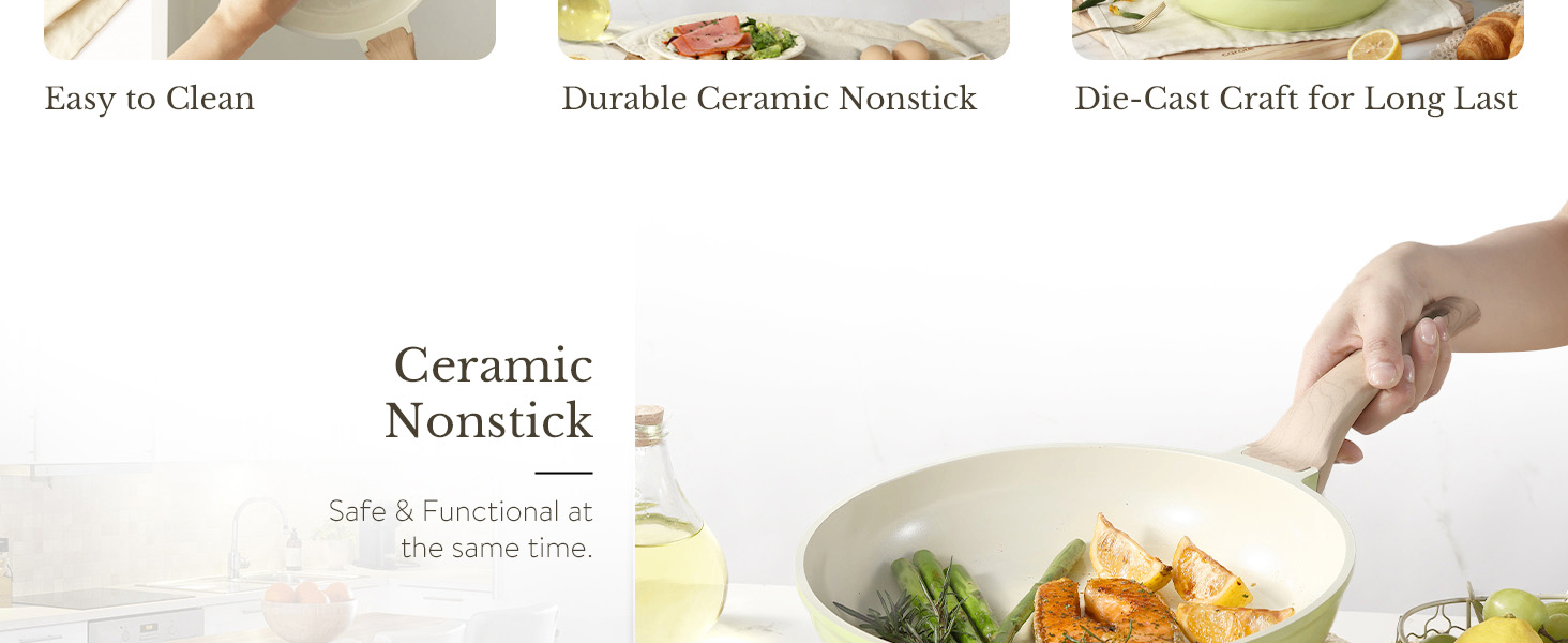 CERAMIC NONSTICK: The incredible ceramic nonstick coating delivers easy releases. seamless transfers. and effortless cleaning.
