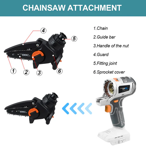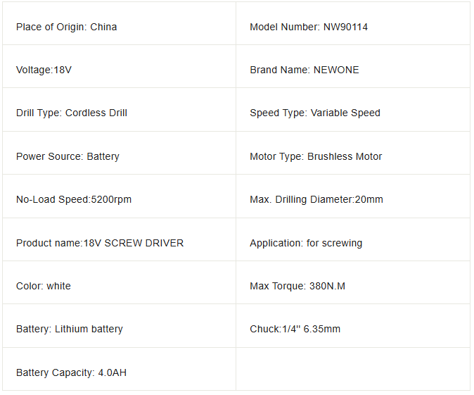 This product is 18V cordless screwdriver with a lithium battery, a maximum torque of 380N.M, a 1/4'' 6.35mm chuck, variable speed, a no-load speed of 5200rpm, and a maximum drilling diameter of 20mm. Additionally, this product has a multifunctional design that can connect 4-inch chainsaw attachments, jig saw attachments, reciprocating saw attachments, impact wrench attachments, electric drill attachments, electric screwdriver attachments, and oscillating multi-tool attachments.