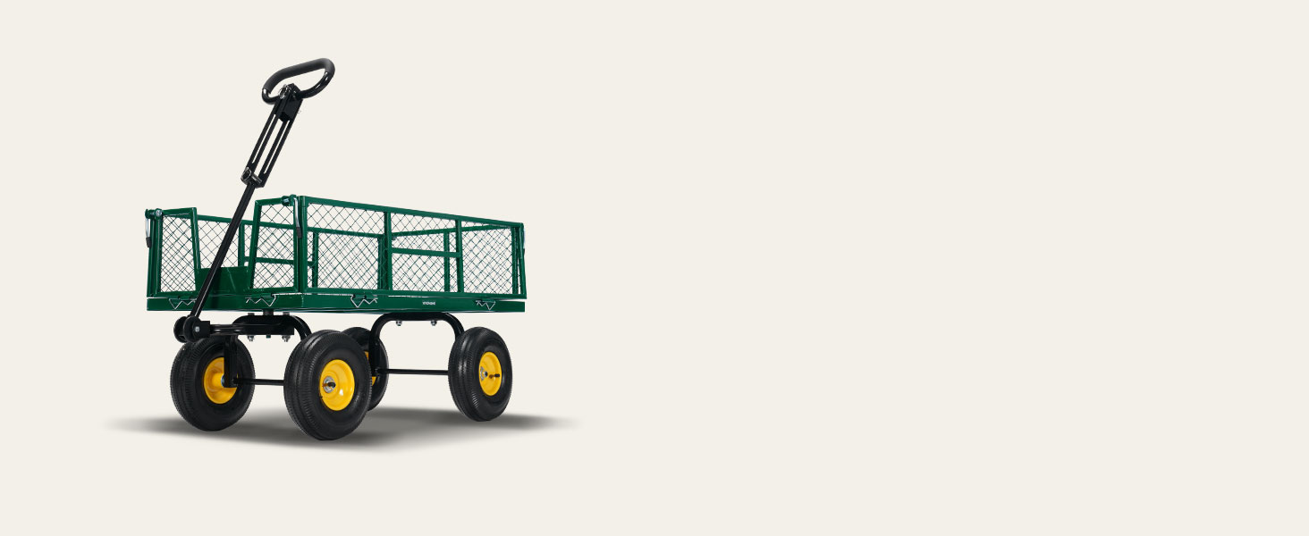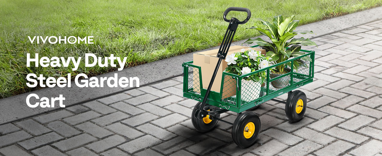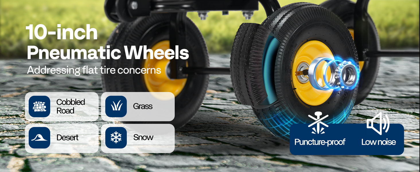 NOISE REDUCTION TIRES: Our garden cart adopts 10-inch pneumatic tires, featuring good elasticity, impact resistance, and noise reduction; And the tires are fixed by lug nuts for further stability; The tight-turning steering and sturdy 4-wheel design ensure smooth moving to tackle any terrain; PLEASE BE AWARE that the tires are not fully inflated due to safe transport consideration