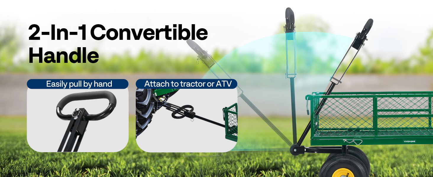 2-IN-1 CONVERTIBLE HANDLES: The versatile 2-in-1 convertible handle can comfortably be pulled by hand and also allows for easy towing behind a lawn tractor or ATV, allowing you to haul heavier loads; Designed with a 180°rotating feature, providing unparalleled flexibility to effortlessly guide the cart in any desired direction; It works well to turn your tiresome transports into one-time trips, showing excellent maneuverability even fully loaded