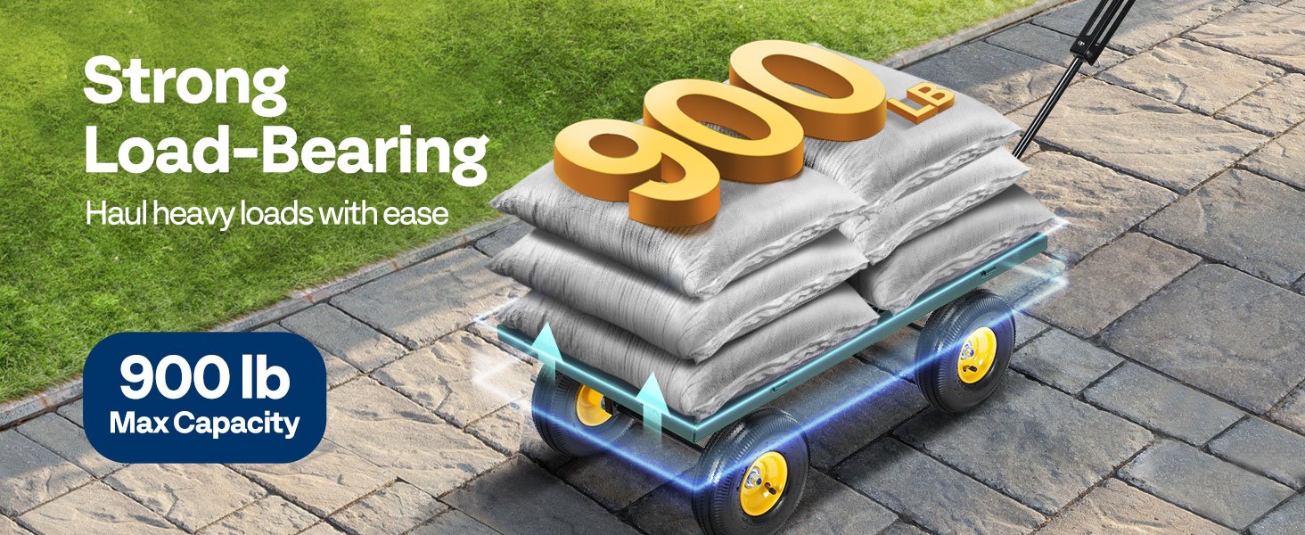 POWERFUL LOAD AND LARGE CAPACITY: Boasting a generous 38-inch x 20-inch wide heavy-duty, rust-proof iron bed, this cart can effortlessly carry up to 900 lb; The crossbars between two tires improve stability and load-bearing capacity; Whether you use this yard wagon to carry planting tools or equipment, or load wood, it will satisfy all your needs; Note: To prolong its life, long-term heavy loading is not recommended)